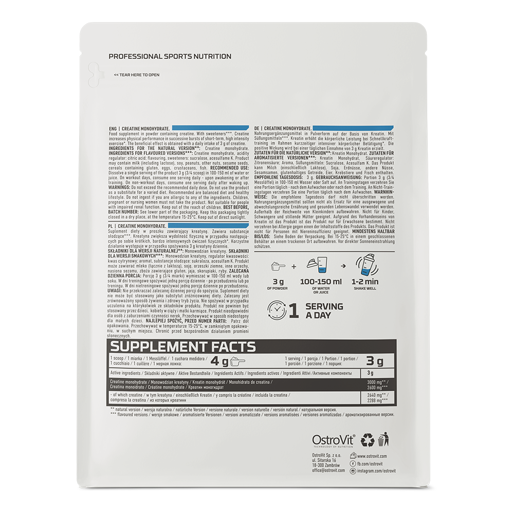 OstroVit uses creatine monohydrate, i.e. a combination of a creatine molecule with a water molecule into one molecule – because creatine is a hydrophilic compound, it combines with water without any problems and thus is a substance that is distinguished by excellent assimilability. Creatine monohydrate is the simplest form of creatine in terms of structure and at the same time the compound that is the most popular among athletes – it is perfect for both beginners and professionals, which is due to the fact that creatine increases physical performance in case of successive, short, very intense physical exercises and beneficial effect occurs when consuming 3 g of creatine per day.